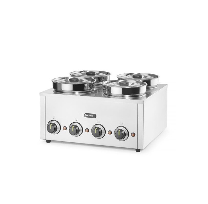 Thermosystem 4 firmy HENDI utrzymuje gorące sosy, zupy i innego rodzaju żywność w zadanej temperaturze bez przypalania. Temperatura może być regulowana na 6 poziomach w zależności od potrzeb produktu. Wytrzymała konstrukcja ze stali nierdzewnej wyposażona jest w nóżki antypoślizgowe zapewniające stabilność.