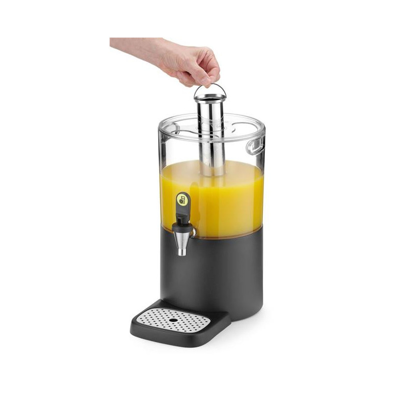 Dyspenser do soków HENDI łączy praktyczną funkcjonalność z estetycznym profesjonalnym wyglądem. Posiada wyjmowaną rurę chłodzącą na lód wykonaną ze stali nierdzewnej, kran zapobiegający kapaniu, umieszczony na 130 mm od podstawy oraz wyjmowaną tacę ociekową z dopasowaną kolorystycznie obudową.