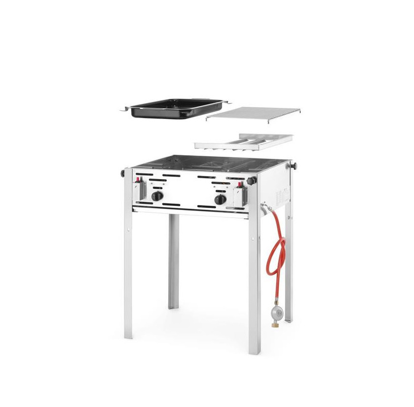 Grill-Master Maxi 50/50HENDI ma dzieloną powierzchnię: z rusztem do grillowanych mięs i warzyw oraz tacką do pieczenia do przygotowywania delikatnych potraw. Posiada iskrownik piezoelektryczny.