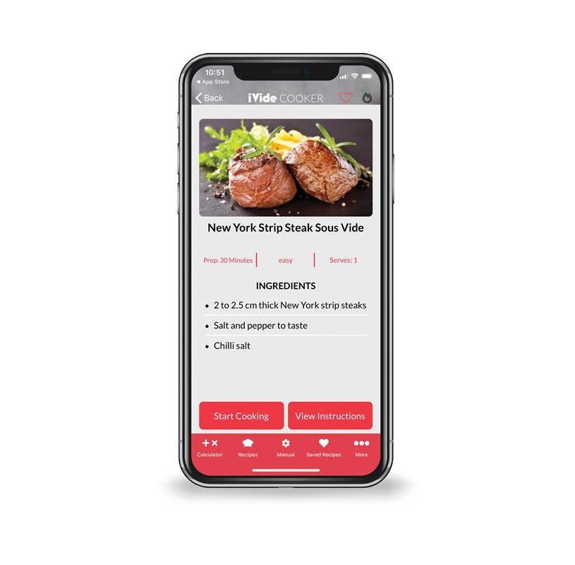 - Aplikacja wyposażona w ponad 600 przepisów umożliwiająca użytkownikowi obliczenie idealnego czasu i temperatury dla wybranej potrawy.