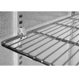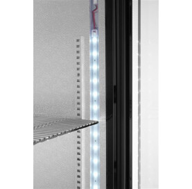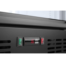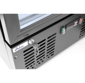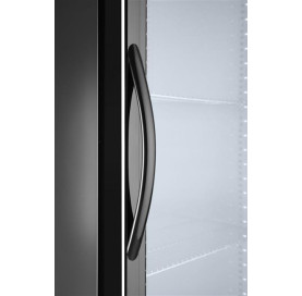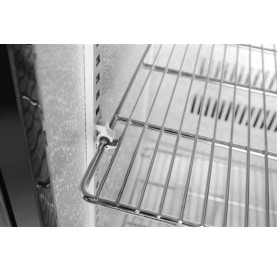 Stalowa obudowa malowana proszkowo na czarno. Wnętrze komory wykonane z tłoczonego aluminium. Samozamykające się drzwi z podwójną szybą i rama z tworzywa sztucznego. Przednia szyba wykonana ze szkła hartowanego. Zamek z kluczykiem. Chłodzenie statyczne wspomagane wentylatorem. Automatyczne odszranianie. Agregat umieszczony pod komorą. Zakres temperatury: 2-10°C. Komora wyposażona w oświetlenie LED. Elektroniczny panel sterowania z cyfrowym wyświetlaczem temperatury. 4 regulowane antypoślizgowe nóżki. Klasa klimatyczna: 4
