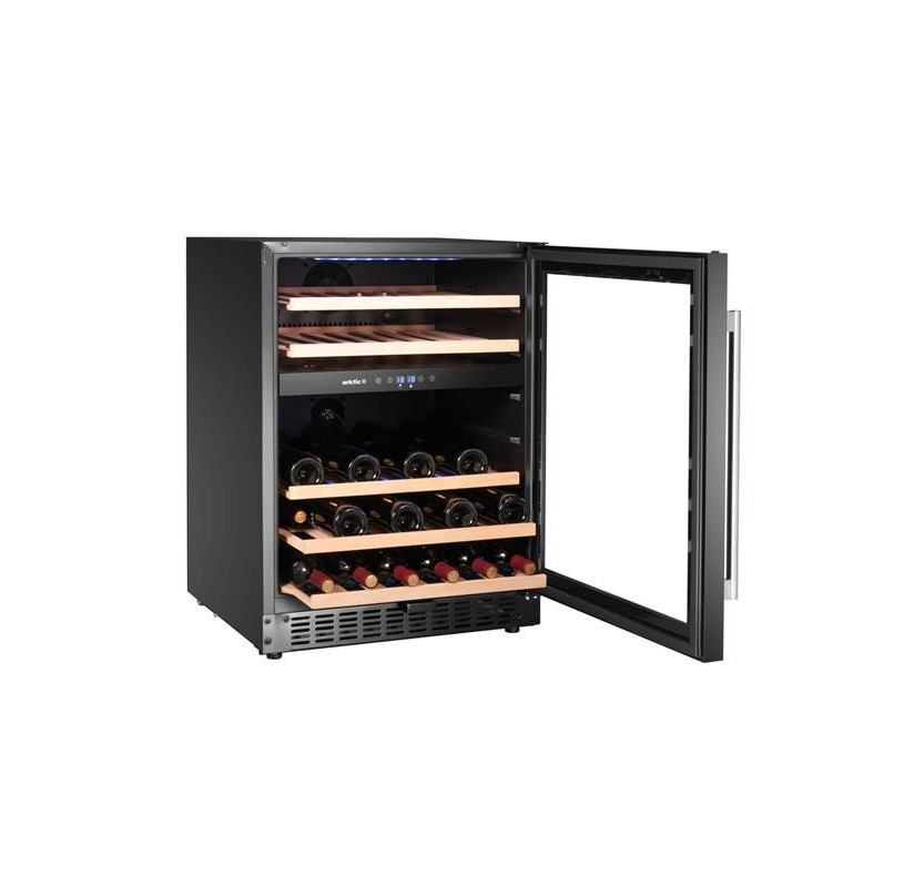 Lodówka do wina, 2-strefowa, 46 butelki, Arktic wyposażona w dwie strefy chłodzenia z niezależną regulacją temperatury. Nadaje się do przechowywania 46 butelek. Obudowa ze stali nierdzewnej malowanej proszkowo na czarno; drzwi z hartowanego szkła bez obramowania z uchwytem ze stali nierdzewnej; wysuwane półki z drewna bukowego; oświetlenie LED. Instalacja zarówno w zabudowie, jak i w wersji wolnostojącej. Cyfrowy wyświetlacz, elektroniczny termostat, automatyczne odszranianie oraz drzwi wyposażone w zamek z kluczykiem.