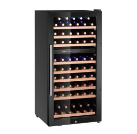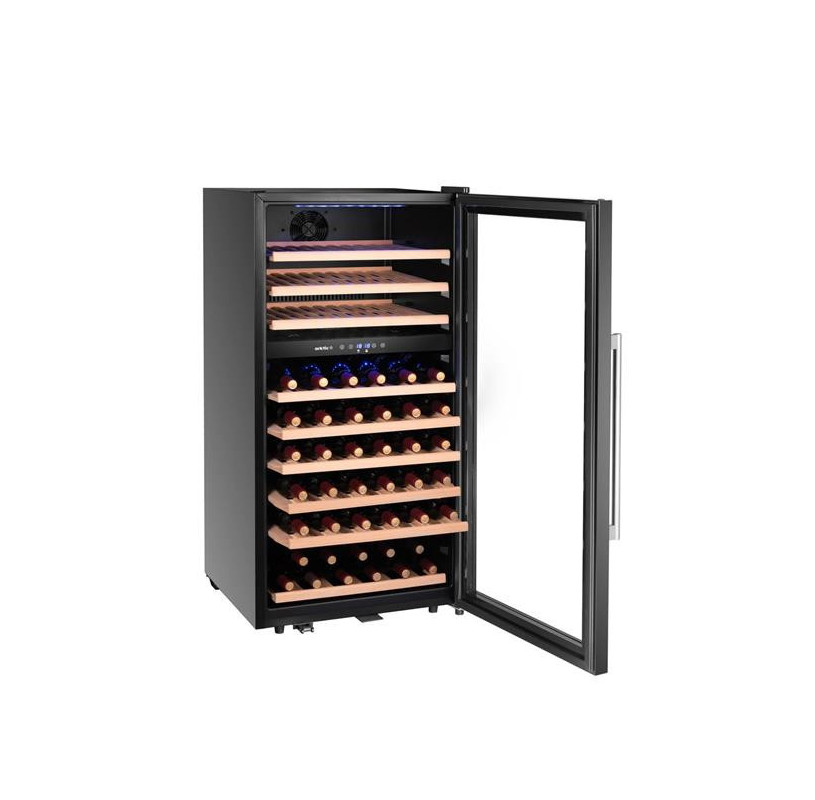 Lodówka do wina, 2-strefowa, 91 butelki Arktic, wyposażona w dwie strefy chłodzenia z niezależną regulacją temperatury. Nadaje się do przechowywania 91 butelek. Obudowa ze stali nierdzewnej malowanej proszkowo na czarno; drzwi z hartowanego szkła bez obramowania; wysuwane półki z drewna bukowego; oświetlenie LED. Instalacja zarówno w zabudowie, jak i w wersji wolnostojącej. Cyfrowy wyświetlacz, elektroniczny termostat, automatyczne odszranianie oraz drzwi wyposażone w zamek z kluczykiem.