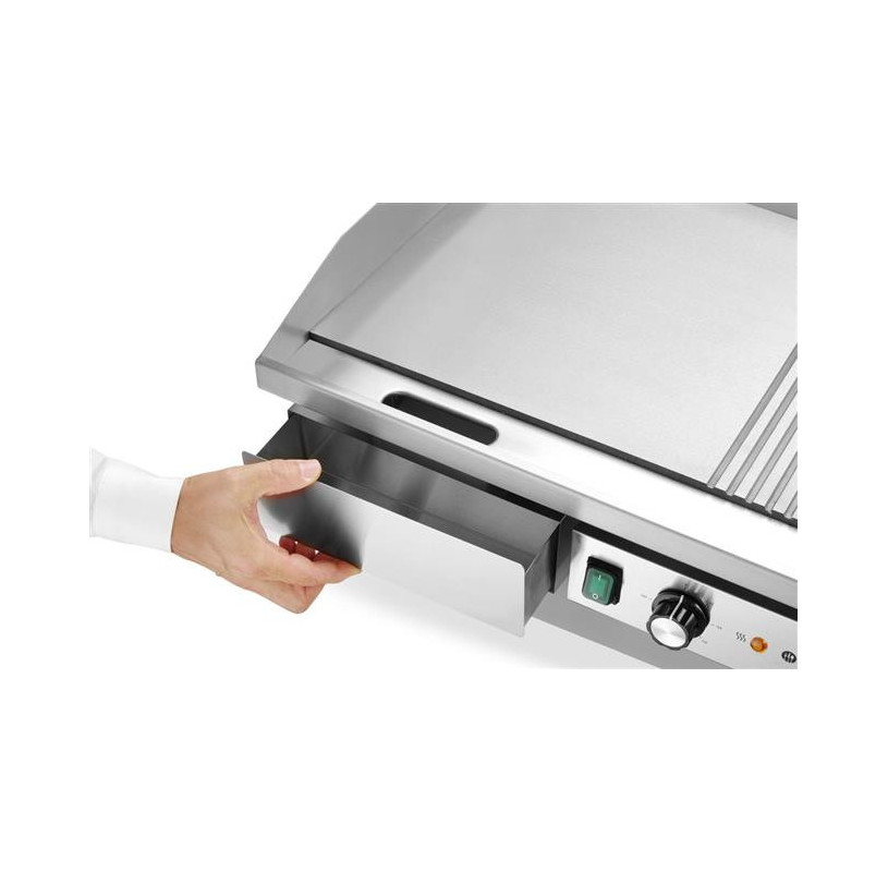 Płyta grillowa w połowie żebrowana HENDI wyróżnia się grillem wykonanym z hartowanej stali nierdzewnej i dwiema strefami grzewczymi, które mogą osiągnąć temperaturę aż do 300°C. Część żebrowana jest idealna do przyrządzania tłustych mięs, na przykład burgerów i kiełbasek, a część gładka idealnie nadaje się do smażenia jajek i naleśników. Połączenie rantu tylnego i wyjmowanej szuflady na tłuszcz sprawia, że urządzenie łatwo utrzymać w czystości.