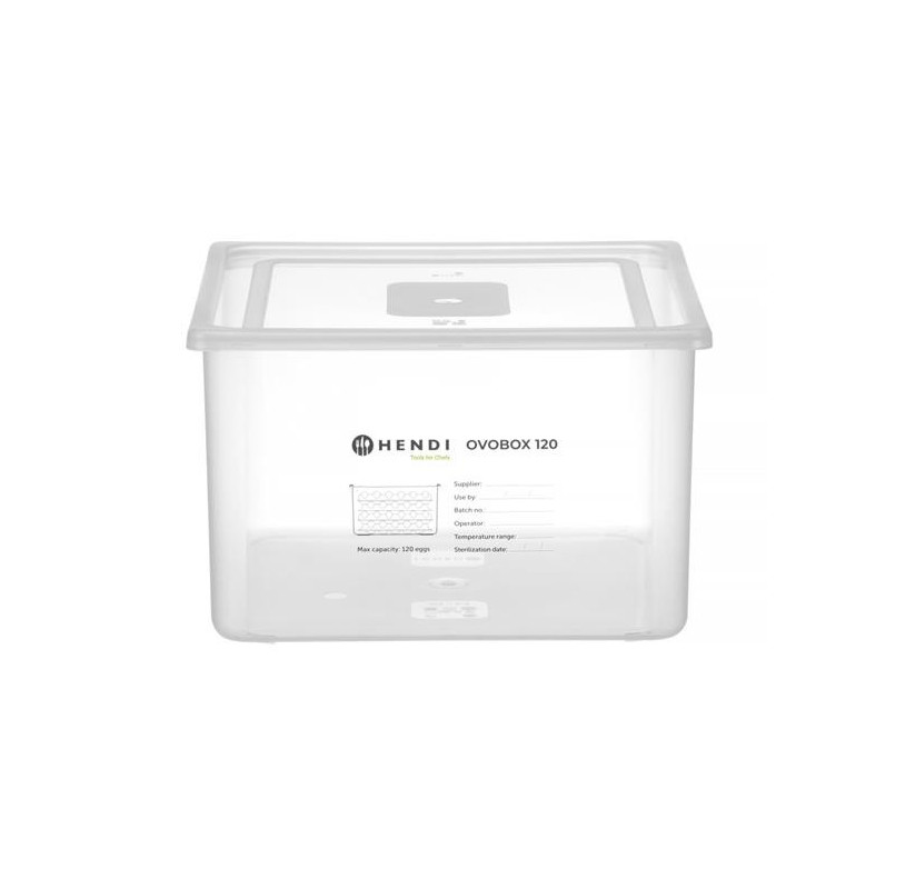 Pojemnik na jajka OVOBOX 120 firmy HENDI to praktyczne rozwiązanie pozwalające bezpiecznie przechowywać sterylizowane jajka i chronić je przed skażeniem salmonellą. Zestaw zawiera wytrzymały pojemnik, pokrywę, 8 tacek na jajka z możliwością piętrowania. Pojemnik mieści 120 jajek.