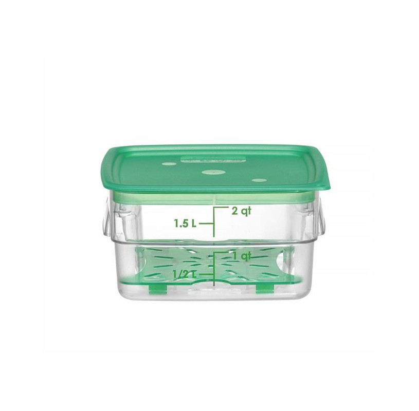 Pojemnik na żywność CamSquares® Fresh Pro firmy Cambro to wielorazowe i przyjazne środowisku rozwiązanie pozwalające na wydłużenie czasu przydatności żywności. Nadaje się do mokrych i suchych produktów. Jest idealny do przechowywania ziół i przypraw, warzyw, mięs, owoców morza czy płynów. Wykonanie z poliwęglanu, materiału odpornego na odbarwianie się, kwasy spożywcze i zapachy, sprawia, że pojemnik jest niezwykle wytrzymały i tym samym doskonale się sprawdzi w profesjonalnych kuchniach. Teksturowana powierzchnia z boku, zaokrąglone rogi i ergonomiczne uchwyty zwiększają wygodę użytkowania. Pokrywki są sprzedawane oddzielne (dostępne w HENDI).