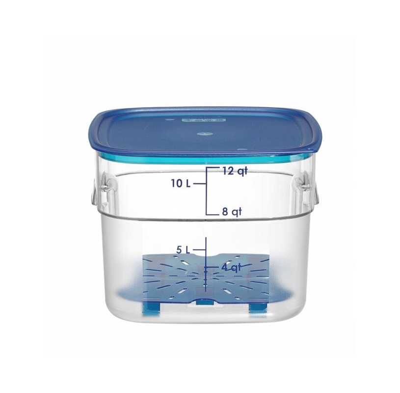 Pojemnik na żywność CamSquares® Fresh Pro firmy Cambro to wielorazowe i przyjazne środowisku rozwiązanie pozwalające na wydłużenie czasu przydatności żywności. Nadaje się do mokrych i suchych produktów. Jest idealny do przechowywania ziół i przypraw, warzyw, mięs, owoców morza czy płynów. Wykonanie z poliwęglanu, materiału odpornego na odbarwianie się, kwasy spożywcze i zapachy, sprawia, że pojemnik jest niezwykle wytrzymały i tym samym doskonale się sprawdzi w profesjonalnych kuchniach. Teksturowana powierzchnia z boku, zaokrąglone rogi i ergonomiczne uchwyty zwiększają wygodę użytkowania. Pokrywki są sprzedawane oddzielne (dostępne w HENDI).