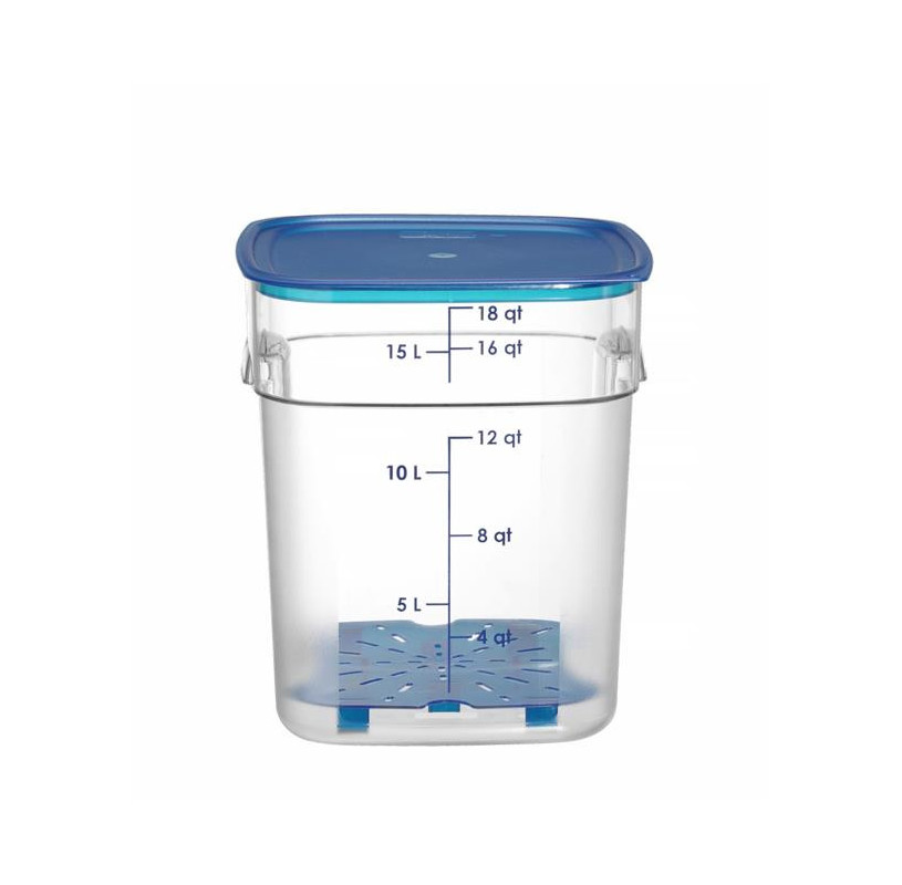 Pojemnik na żywność CamSquares® Fresh Pro firmy Cambro to wielorazowe i przyjazne środowisku rozwiązanie pozwalające na wydłużenie czasu przydatności żywności. Nadaje się do mokrych i suchych produktów. Jest idealny do przechowywania ziół i przypraw, warzyw, mięs, owoców morza czy płynów. Wykonanie z poliwęglanu, materiału odpornego na odbarwianie się, kwasy spożywcze i zapachy, sprawia, że pojemnik jest niezwykle wytrzymały i tym samym doskonale się sprawdzi w profesjonalnych kuchniach. Teksturowana powierzchnia z boku, zaokrąglone rogi i ergonomiczne uchwyty zwiększają wygodę użytkowania. Pokrywki są sprzedawane oddzielne (dostępne w HENDI).