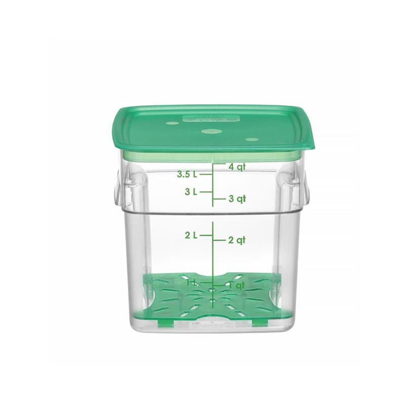 Pojemnik na żywność CamSquares® Fresh Pro firmy Cambro to wielorazowe i przyjazne środowisku rozwiązanie pozwalające na wydłużenie czasu przydatności żywności. Nadaje się do mokrych i suchych produktów. Jest idealny do przechowywania ziół i przypraw, warzyw, mięs, owoców morza czy płynów. Wykonanie z poliwęglanu, materiału odpornego na odbarwianie się, kwasy spożywcze i zapachy, sprawia, że pojemnik jest niezwykle wytrzymały i tym samym doskonale się sprawdzi w profesjonalnych kuchniach. Teksturowana powierzchnia z boku, zaokrąglone rogi i ergonomiczne uchwyty zwiększają wygodę użytkowania. Pokrywki są sprzedawane oddzielne (dostępne w HENDI).